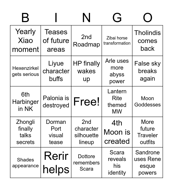 This bingo card has a free space and 29 words: Shades appearance, Sandrone is destroyed, Palonia is destroyed, More Sinners, Yearly Xiao moment, 2nd Roadmap, Liyue character buffs, Dorman Port visual tease, Lantern Rite themed MW, Rerir helps, Moon Goddesses, Sandrone uses Rene esque powers, Dottore remembers Scara, Scara reveals his identity, False sky breaks again, Harbingers help fight Dottore, 2nd character silhouette lineup, Zhongli finally talks secrets, Tholindis comes back, 6th Harbinger in NK, 4th Moon is created, Tsaritza appearance, Arle uses more abyss power, Hexenzirkel gets serious, Zibai horse transformation, Teases of future areas, More future Traveler outfits, HP finally wakes up and Fatui civil war.