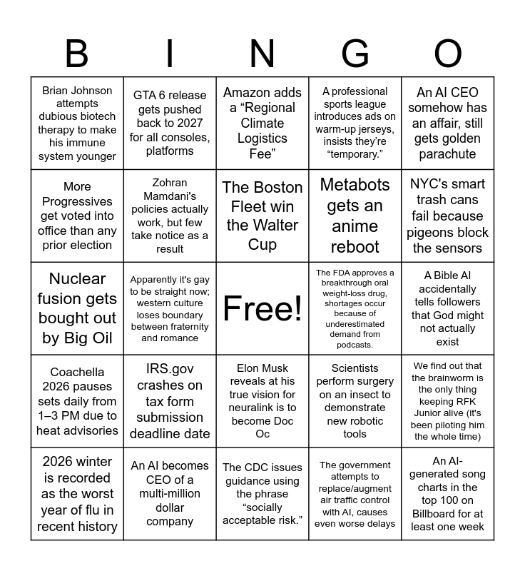 This bingo card has a free space and 26 words: Elon Musk reveals at his true vision for neuralink is to become Doc Oc, The government attempts to replace/augment air traffic control with AI, causes even worse delays, The Boston Fleet win the Walter Cup, An AI becomes CEO of a multi-million dollar company, An AI CEO somehow has an affair, still gets golden parachute, Brian Johnson attempts dubious biotech therapy to make his immune system younger, More Progressives get voted into office than any prior election, GTA 6 release gets pushed back to 2027 for all consoles, platforms, A Bible AI accidentally tells followers that God might not actually exist, Scientists perform surgery on an insect to demonstrate new robotic tools, Metabots gets an anime reboot, Nuclear fusion gets bought out by Big Oil, We find out that the brainworm is the only thing keeping RFK Junior alive (it's been piloting him the whole time), 2026 winter is recorded as the worst year of flu in recent history, Apparently it's gay to be straight now; western culture loses boundary between fraternity and romance, Nvidia buys stakes in more chip fab companies, circle jerk intensifies, A professional sports league introduces ads on warm-up jerseys, insists they’re “temporary.”, Coachella 2026 pauses sets daily from 1–3 PM due to heat advisories, Amazon adds a “Regional Climate Logistics Fee”, An AI-generated song charts in the top 100 on Billboard for at least one week, NYC's smart trash cans fail because pigeons block the sensors, The CDC issues guidance using the phrase “socially acceptable risk.”, The FDA approves a breakthrough oral weight-loss drug, shortages occur because of underestimated demand from podcasts., IRS.gov crashes on tax form submission deadline date, Zohran Mamdani's policies actually work, but few take notice as a result and Canadian Ice Hockey player skates into the boards during Olympic games because the rink was built too small.