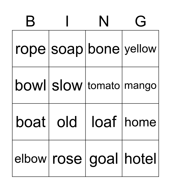 This bingo card has 16 words: rose, home, bone, rope, boat, soap, loaf, goal, bowl, slow, elbow, yellow, old, mango, tomato and hotel.