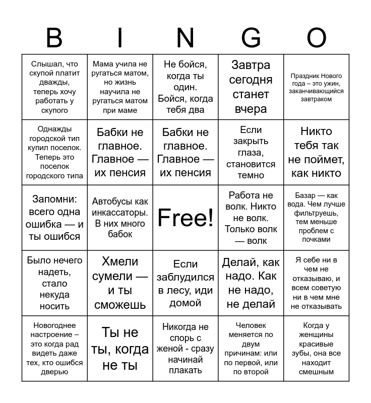 This bingo card has a free space and 24 words: Хмели сумели — и ты сможешь, Ты не ты, когда не ты, Бабки не главное. Главное — их пенсия, Новогоднее настроение – это когда рад видеть даже тех, кто ошибся дверью, Праздник Нового года – это ужин, заканчивающийся завтраком, Слышал, что скупой платит дважды, теперь хочу работать у скупого, Однажды городской тип купил поселок. Теперь это поселок городского типа, Мама учила не ругаться матом, но жизнь научила не ругаться матом при маме, Работа не волк. Никто не волк. Только волк — волк, Если заблудился в лесу, иди домой, Если закрыть глаза, становится темно, Запомни: всего одна ошибка — и ты ошибся, Делай, как надо. Как не надо, не делай, Я себе ни в чем не отказываю, и всем советую ни в чем мне не отказывать, Бабки не главное. Главное — их пенсия, Человек меняется по двум причинам: или по первой, или по второй, Базар — как вода. Чем лучше фильтруешь, тем меньше проблем с почками, Не бойся, когда ты один. Бойся, когда тебя два, Никто тебя так не поймет, как никто, Автобусы как инкассаторы. В них много бабок, Когда у женщины красивые зубы, она все находит смешным, Было нечего надеть, стало некуда носить, Завтра сегодня станет вчера and Никогда не спорь с женой - сразу начинай плакать.