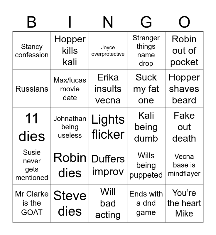 This bingo card has a free space and 24 words: Robin dies, Steve dies, Erika insults vecna, Mr Clarke is the GOAT, Robin out of pocket, Stancy confession, Russians, Hopper kills kali, Kali being dumb, Duffers improv, Suck my fat one, 11 dies, Wills being puppeted, Vecna base is mindflayer, Max/lucas movie date, Ends with a dnd game, Fake out death, Joyce overprotective, Hopper shaves beard, Johnathan being useless, You’re the heart Mike, Susie never gets mentioned, Stranger things name drop and Will bad acting.