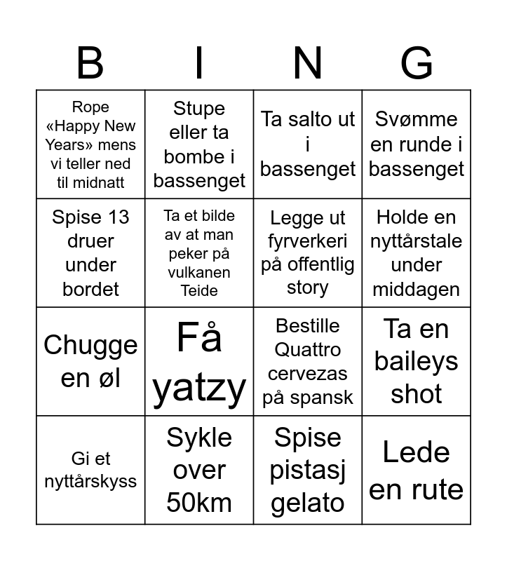 This bingo card has 16 words: Sykle over 50km, Ta en baileys shot, Ta salto ut i bassenget, Rope «Happy New Years» mens vi teller ned til midnatt, Chugge en øl, Stupe eller ta bombe i bassenget, Bestille Quattro cervezas på spansk, Spise pistasj gelato, Spise 13 druer under bordet, Ta et bilde av at man peker på vulkanen Teide, Gi et nyttårskyss, Svømme en runde i bassenget, Få yatzy, Holde en nyttårstale under middagen, Legge ut fyrverkeri på offentlig story and Lede en rute.