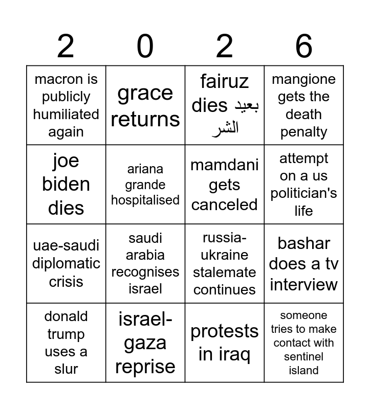 This bingo card has 16 words: israel-gaza reprise, bashar does a tv interview, fairuz dies بعيد الشر, macron is publicly humiliated again, uae-saudi diplomatic crisis, grace returns, russia-ukraine stalemate continues, protests in iraq, joe biden dies, ariana grande hospitalised, donald trump uses a slur, mangione gets the death penalty, saudi arabia recognises israel, attempt on a us politician's life, mamdani gets canceled and someone tries to make contact with sentinel island.