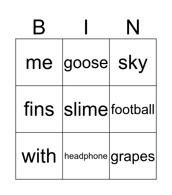 This bingo card has a free space and 8 words: football, sky, goose, with, me, grapes, fins and headphone.