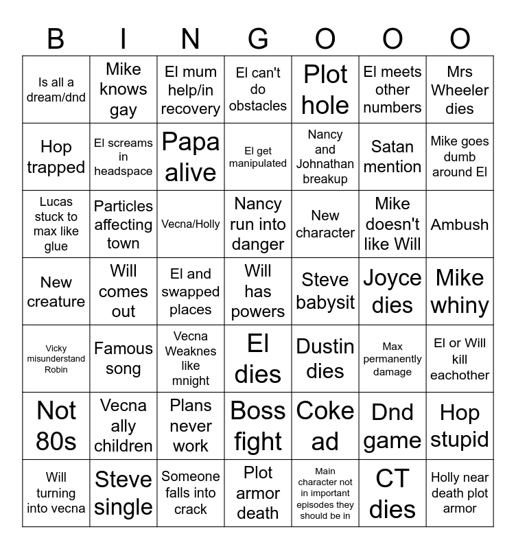 This bingo card has a free space and 48 words: Coke ad, Satan mention, Plot armor death, Will comes out, Vecna/Holly, Mike whiny, Mike knows gay, Steve single, El meets other numbers, El dies, Mrs Wheeler dies, El can't do obstacles, Mike doesn't like Will, New character, Not 80s, Joyce dies, Hop trapped, Mike goes dumb around El, Dnd game, Plot hole, Nancy and Johnathan breakup, El and swapped places, Is all a dream/dnd, El screams in headspace, Hop stupid, Papa alive, Ambush, Will turning into vecna, Nancy run into danger, Particles affecting town, CT dies, Steve babysit, El or Will kill eachother, Vecna ally children, New creature, Dustin dies, Max permanently damage, Lucas stuck to max like glue, Vecna Weaknes like mnight, Plans never work, Vicky misunderstand Robin, Holly near death plot armor, El mum help/in recovery, Someone falls into crack, El get manipulated, Boss fight, Famous song and Main character not in important episodes they should be in.