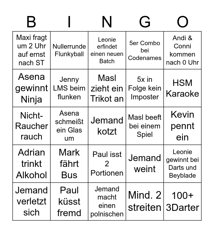 This bingo card has a free space and 24 words: Mark fährt Bus, Paul küsst fremd, Masl zieht ein Trikot an, Jemand verletzt sich, Andi & Conni kommen nach 0 Uhr, Maxi fragt um 2 Uhr auf ernst nach ST, Asena gewinnt Ninja, Nullerrunde Flunkyball, Masl beeft bei einem Spiel, Paul isst 2 Portionen, 5x in Folge kein Imposter, Nicht-Raucher rauch, Jemand weint, Leonie gewinnt bei Darts und Beyblade, Jenny LMS beim flunken, Mind. 2 streiten, Kevin pennt ein, Leonie erfindet einen neuen Batch, HSM Karaoke, Asena schmeißt ein Glas um, 100+ 3Darter, Adrian trinkt Alkohol, 5er Combo bei Codenames and Jemand macht einen polnischen.