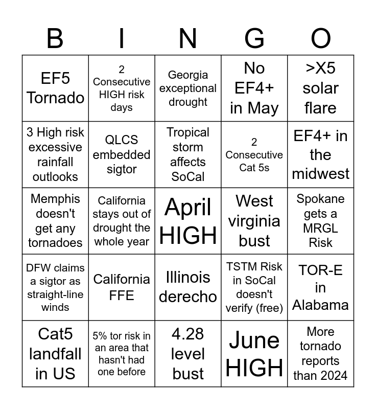 This bingo card has 25 words: California FFE, 4.28 level bust, Tropical storm affects SoCal, Cat5 landfall in US, >X5 solar flare, EF5 Tornado, 3 High risk excessive rainfall outlooks, 2 Consecutive HIGH risk days, West virginia bust, Illinois derecho, 2 Consecutive Cat 5s, Memphis doesn't get any tornadoes, TSTM Risk in SoCal doesn't verify (free), TOR-E in Alabama, QLCS embedded sigtor, More tornado reports than 2024, Spokane gets a MRGL Risk, Georgia exceptional drought, EF4+ in the midwest, California stays out of drought the whole year, April HIGH, 5% tor risk in an area that hasn't had one before, DFW claims a sigtor as straight-line winds, No EF4+ in May and June HIGH.