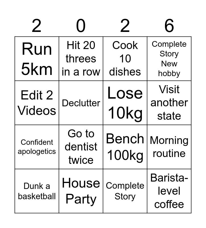 This bingo card has 16 words: House Party, Morning routine, Cook 10 dishes, Run 5km, Confident apologetics, Hit 20 threes in a row, Bench 100kg, Complete Story, Edit 2 Videos, Declutter, Dunk a basketball, Complete Story New hobby, Go to dentist twice, Visit another state, Lose 10kg and Barista-level coffee.