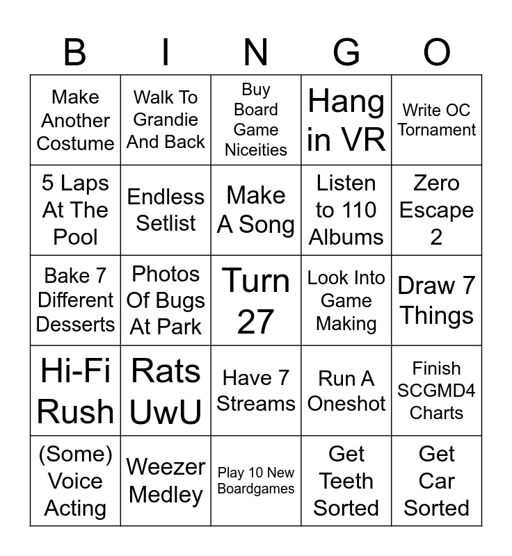 This bingo card has a free space and 24 words: Rats UwU, Weezer Medley, Make A Song, (Some) Voice Acting, Write OC Tornament, Make Another Costume, 5 Laps At The Pool, Walk To Grandie And Back, Look Into Game Making, Have 7 Streams, Listen to 110 Albums, Bake 7 Different Desserts, Run A Oneshot, Finish SCGMD4 Charts, Endless Setlist, Get Teeth Sorted, Draw 7 Things, Buy Board Game Niceities, Zero Escape 2, Photos Of Bugs At Park, Get Car Sorted, Hi-Fi Rush, Hang in VR and Play 10 New Boardgames.