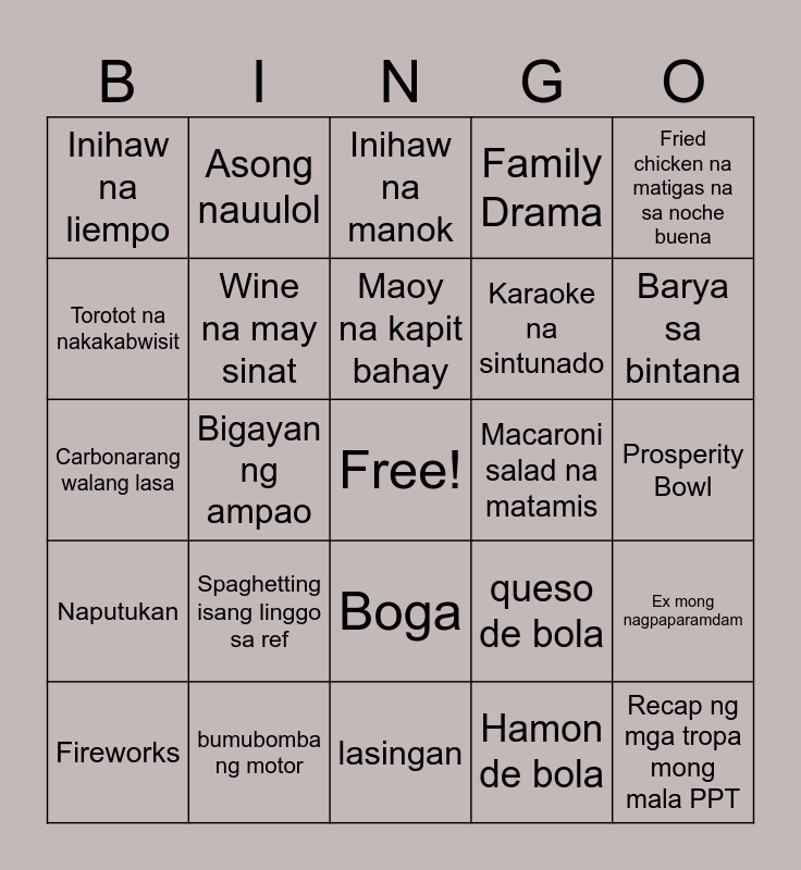 This bingo card has a free space and 24 words: Spaghetting isang linggo sa ref, bumubomba ng motor, Maoy na kapit bahay, Fireworks, Fried chicken na matigas na sa noche buena, Inihaw na liempo, Torotot na nakakabwisit, Asong nauulol, Macaroni salad na matamis, Boga, Karaoke na sintunado, Carbonarang walang lasa, queso de bola, Ex mong nagpaparamdam, Wine na may sinat, Hamon de bola, Prosperity Bowl, Inihaw na manok, Barya sa bintana, Bigayan ng ampao, Recap ng mga tropa mong mala PPT, Naputukan, Family Drama and lasingan.