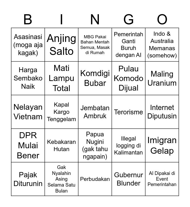 This bingo card has 25 words: Kebakaran Hutan, Perbudakan, Komdigi Bubar, Pajak Diturunin, Indo & Australia Memanas (somehow), Asasinasi (moga aja kagak), Harga Sembako Naik, Anjing Salto, Terorisme, Papua Nugini (gak tahu ngapain), Pulau Komodo Dijual, Nelayan Vietnam, Illegal logging di Kalimantan, Imigran Gelap, Mati Lampu Total, AI Dipakai di Event Pemerintahan, Internet Diputusin, MBG Pakai Bahan Mentah Semua, Masak di Rumah, Maling Uranium, Kapal Kargo Tenggelam, Jembatan Ambruk, Gak Nyalahin Asing Selama Satu Bulan, DPR Mulai Bener, Pemerintah Ganti Buruh dengan AI and Gubernur Blunder.