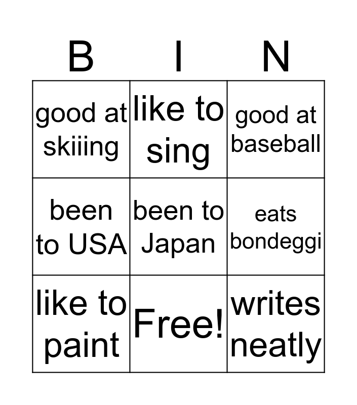 This bingo card has 10 words: Free!, good at baseball, good at skiiing, been to Japan, been to USA, like to paint, like to sing, is the younger sibling, eats bondeggi and writes neatly.