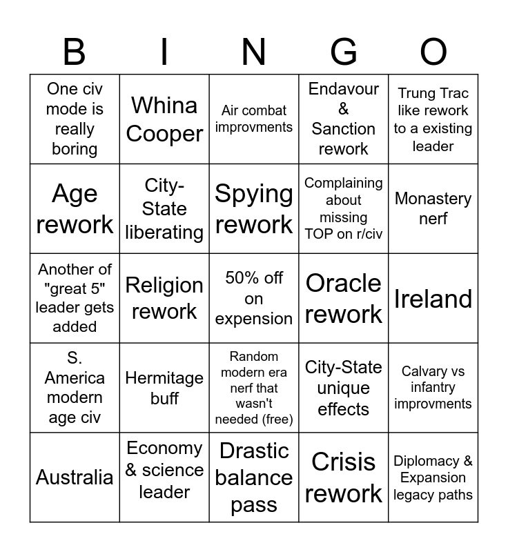 This bingo card has a free space and 24 words: Australia, Hermitage buff, Spying rework, Crisis rework, Trung Trac like rework to a existing leader, One civ mode is really boring, Whina Cooper, Air combat improvments, Oracle rework, Ireland, Another of "great 5" leader gets added, City-State liberating, City-State unique effects, Calvary vs infantry improvments, Age rework, Economy & science leader, Drastic balance pass, Endavour & Sanction rework, Monastery nerf, S. America modern age civ, Religion rework, Random modern era nerf that wasn't needed (free), Complaining about missing TOP on r/civ and Diplomacy & Expansion legacy paths.
