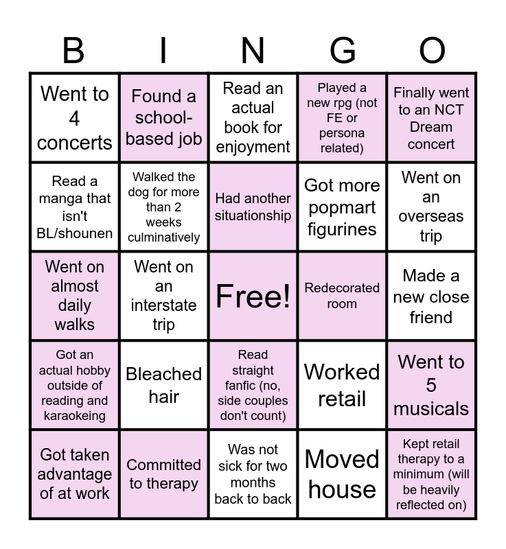 This bingo card has a free space and 24 words: Got taken advantage of at work, Bleached hair, Had another situationship, Moved house, Finally went to an NCT Dream concert, Went to 4 concerts, Found a school-based job, Read an actual book for enjoyment, Redecorated room, Made a new close friend, Went on almost daily walks, Walked the dog for more than 2 weeks culminatively, Worked retail, Went to 5 musicals, Read a manga that isn't BL/shounen, Committed to therapy, Was not sick for two months back to back, Played a new rpg (not FE or persona related), Went on an overseas trip, Got an actual hobby outside of reading and karaokeing, Went on an interstate trip, Read straight fanfic (no, side couples don't count), Got more popmart figurines and Kept retail therapy to a minimum (will be heavily reflected on).