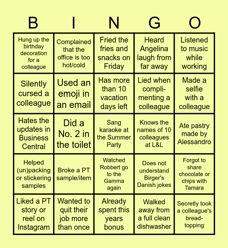 This bingo card has 27 words: Does not understand Birger's Danish jokes, Secretly took a colleague's bread-topping, Lied when compli-menting a colleague, Already spent this years bonus, Silently cursed a colleague, Fried the fries and snacks on Friday, Complained that the office is too hot/cold, Helped (un)packing or stickering samples, Knows the names of 10 colleagues at L&L, Forgot to share chocolate or chips with Tamara, Hates the updates in Business Central, Heard Angelina laugh from far away, Liked a PT story or reel on Instagram, Wanted to quit their job more than once, Made a selfie with a colleague, Danced at the 80's Christmas Party, Used an emoji in an email, Has more than 10 vacation days left, Broke a PT sample/item, Hung up the birthday decoration for a colleague, Ate pastry made by Alessandro, Walked away from a full clean dishwasher, Did a No. 2 in the toilet, Sang karaoke at the Summer Party, Watched Robbert go to the Gamma again, Listened to music while working and Watched a show/ movie on your phone.