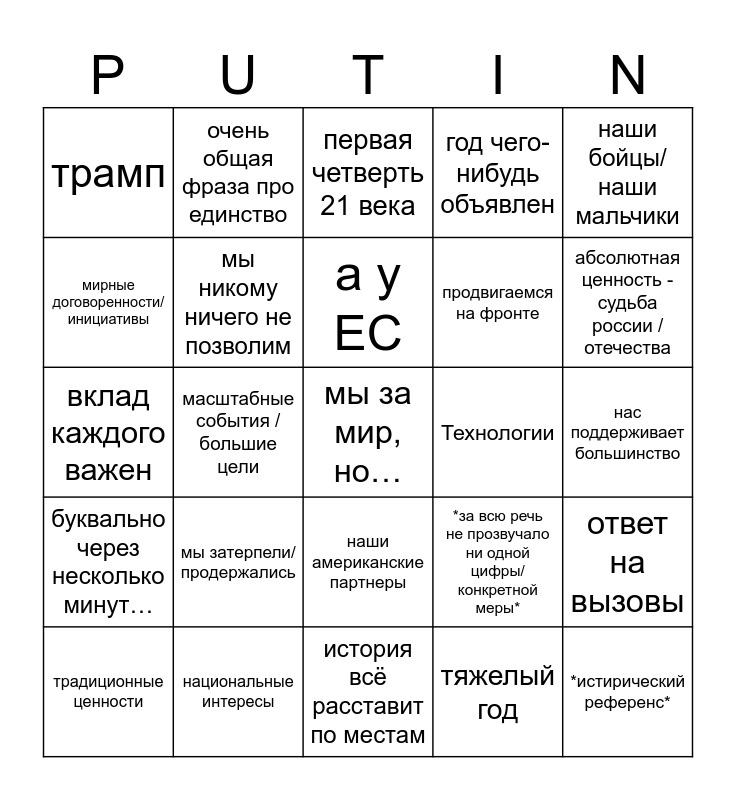 This bingo card has a free space and 24 words: мы затерпели/продержались, национальные интересы, а у ЕС, традиционные ценности, наши бойцы/наши мальчики, трамп, мирные договоренности/инициативы, очень общая фраза про единство, Технологии, наши американские партнеры, продвигаемся на фронте, вклад каждого важен, *за всю речь не прозвучало ни одной цифры/конкретной меры*, ответ на вызовы, мы никому ничего не позволим, тяжелый год, нас поддерживает большинство, первая четверть 21 века, абсолютная ценность - судьба россии / отечества, масштабные события / большие цели, *истирический референс*, буквально через несколько минут…, год чего-нибудь объявлен and история всё расставит по местам.