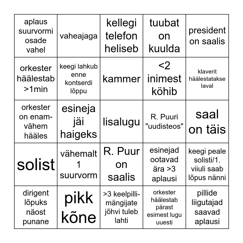 This bingo card has a free space and 24 words: vähemalt 1 suurvorm, pikk kõne, kammer, dirigent lõpuks näost punane, president on saalis, aplaus suurvormi osade vahel, orkester häälestab >1min, vaheajaga, R. Puuri "uudisteos", R. Puur on saalis, <2 inimest köhib, orkester on enam-vähem hääles, esinejad ootavad ära >3 aplausi, keegi peale solisti/1. viiuli saab lõpus nänni, keegi lahkub enne kontserdi lõppu, orkester häälestab pärast esimest lugu uuesti, saal on täis, kellegi telefon heliseb, klaverit häälestatakse laval, esineja jäi haigeks, pillide liigutajad saavad aplausi, solist, tuubat on kuulda and >3 keelpilli-mängijate jõhvi tuleb lahti.