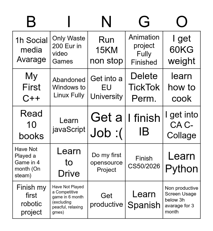 This bingo card has 25 words: Learn to Drive, Get productive, Get into a EU University, Finish my first robotic project, I get 60KG weight, 1h Social media Avarage, My First C++, Only Waste 200 Eur in video Games, I finish IB, Do my first opensource Project, Delete TickTok Perm., Read 10 books, Finish CS50/2026, Learn Python, Abandoned Windows to Linux Fully, Non productive Screen Usage below 3h avarage for 3 month, I get into CA C-Collage, Run 15KM non stop, learn how to cook, Learn javaScript, Get a Job :(, Have Not Played a Competitive game in 6 month (excluding peacful, relaxing gmes), Have Not Played a Game in 4 month (On steam), Animation project Fully Finished and Learn Spanish.