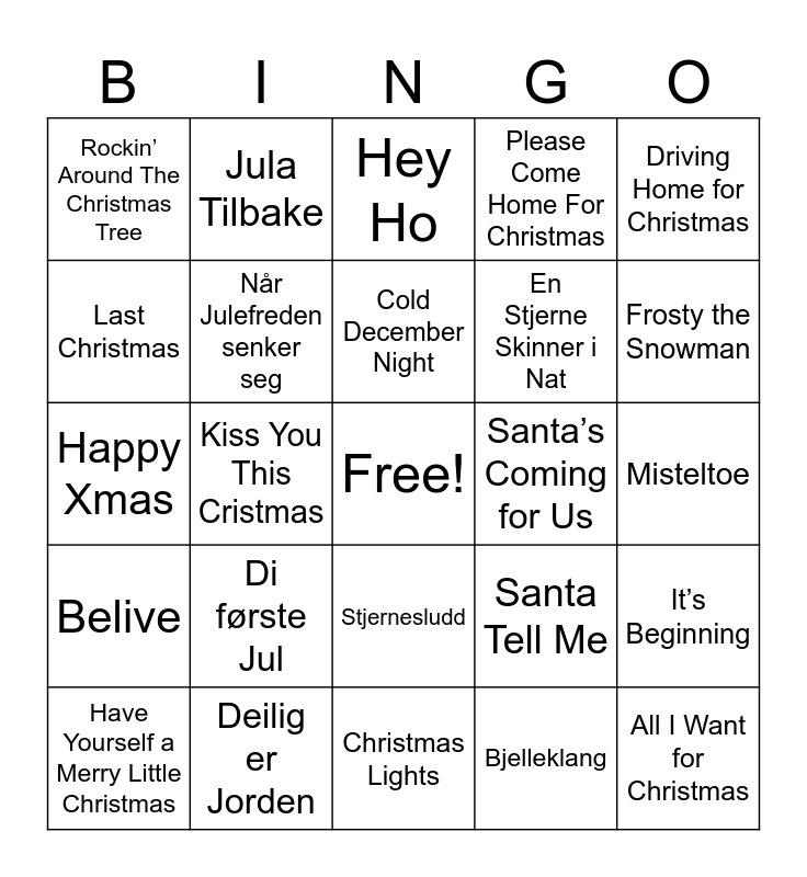 This bingo card has a free space and 28 words: It’s Beginning, Himmel på Jord, En Stjerne Skinner i Nat, Bjelleklang, Last Christmas, Hey Ho, Jula Tilbake, Belive, Santa’s Coming for Us, Have Yourself a Merry Little Christmas, Happy Xmas, Please Come Home For Christmas, Deilig er Jorden, Christmas Lights, Frosty the Snowman, Snømannen Kalle, Di første Jul, Når Julefreden senker seg, Cold December Night, Stjernesludd, Rockin’ Around The Christmas Tree, Tenn Lys, All I Want for Christmas, Kiss You This Cristmas, Misteltoe, Santa Tell Me, Driving Home for Christmas and Når Himlen faller ned.