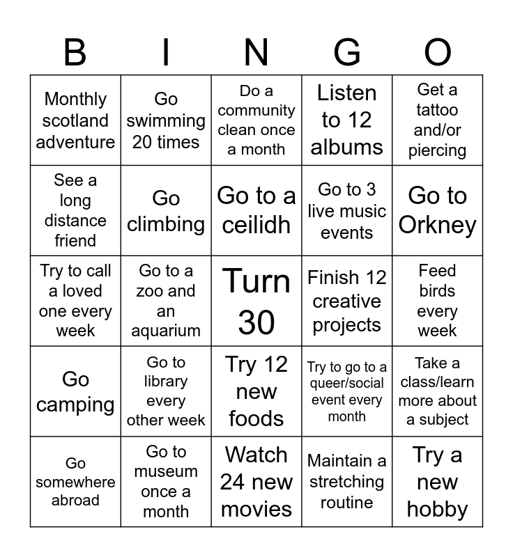 This bingo card has a free space and 24 words: Go to library every other week, Go to museum once a month, Go to a ceilidh, Go somewhere abroad, Get a tattoo and/or piercing, Monthly scotland adventure, See a long distance friend, Go swimming 20 times, Finish 12 creative projects, Try 12 new foods, Go to 3 live music events, Try to call a loved one every week, Try to go to a queer/social event every month, Take a class/learn more about a subject, Go climbing, Maintain a stretching routine, Feed birds every week, Do a community clean once a month, Go to Orkney, Go to a zoo and an aquarium, Try a new hobby, Go camping, Listen to 12 albums and Watch 24 new movies.