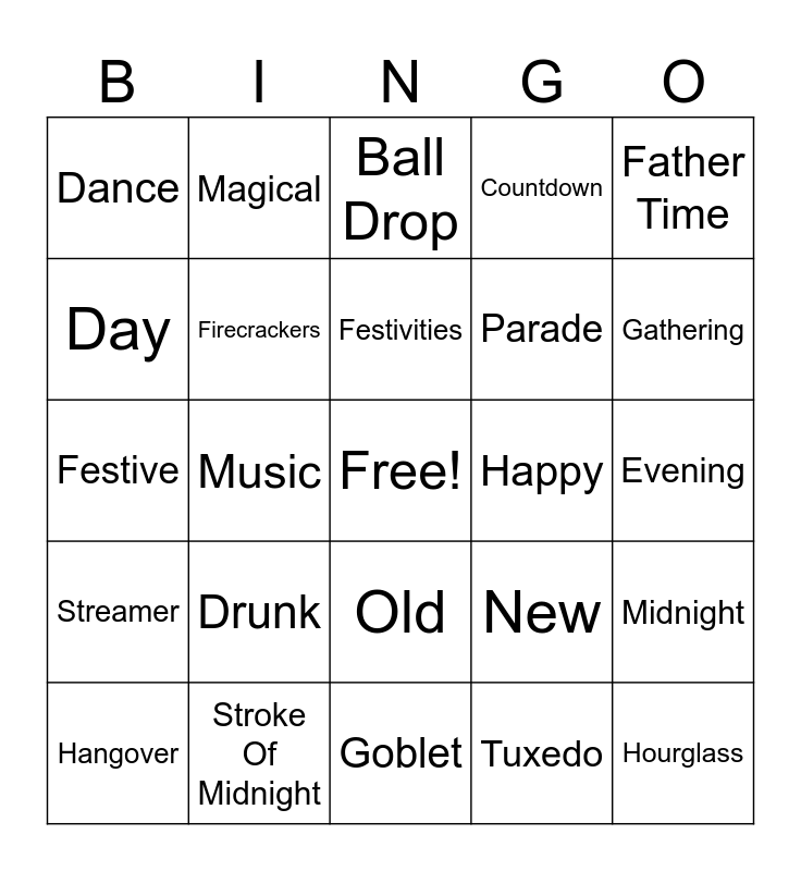 This bingo card has a free space and 79 words: Auld Lang Syne, Baby, Ball Drop, Balloons, Bubbly, Calendar, Celebrate, Celebratory, Champagne, Cheers, Clock, Confetti, Countdown, Dance, Dancing, Day, December, Drunk, Eve, Evening, Extravaganza, Father Time, Festive, Festivities, Firecrackers, Fireworks, Fireworks, First, Flute, Games, Gathering, Glasses, Goblet, Gown, Hangover, Happy, Hat, Holiday, Horns, Hourglass, Invitation, Invite, January, Kiss, Last, Magical, Mask, Memorable, Memories, Merry-Making, Midnight, Music, New, New Year, New Year’s, New Year’s Eve, New Year’s Day, Noise Maker, Noisemaker, Old, Parade, Party, Party Favor, Party Hat, Postcard, Prosperous, Resolutions, Ring, Sparkler, Streamer, Stroke Of Midnight, Time, Times Square, Toast, Tradition, Tuxedo, Twelve O’Clock, Vow and Year.