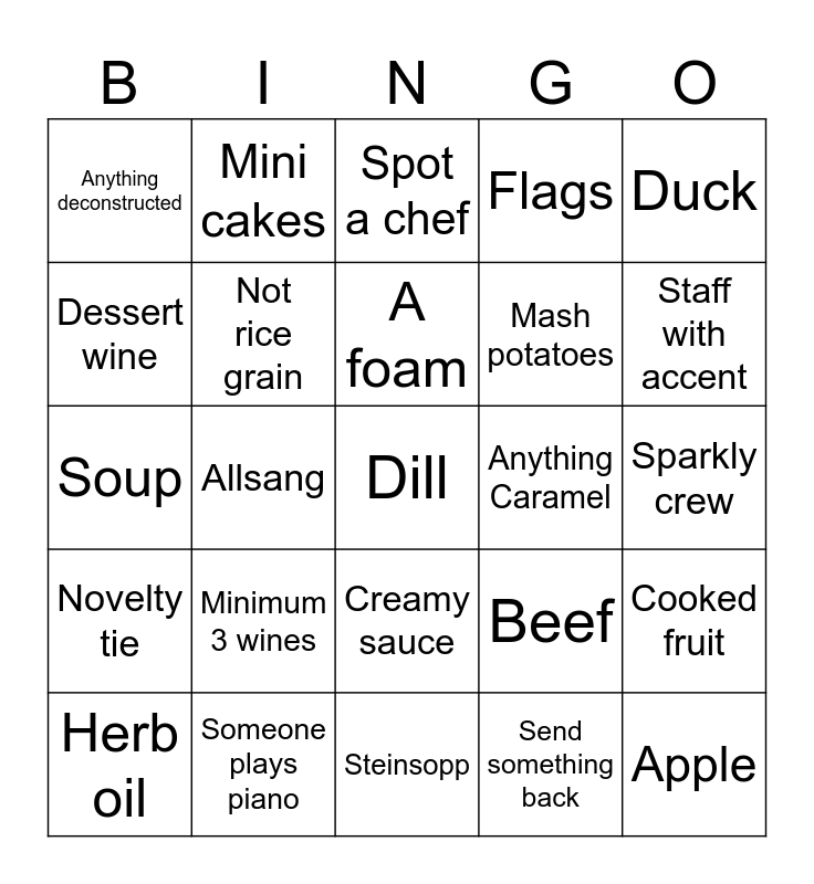 This bingo card has 25 words: Minimum 3 wines, Steinsopp, A foam, Herb oil, Duck, Anything deconstructed, Dessert wine, Mini cakes, Anything Caramel, Creamy sauce, Mash potatoes, Soup, Beef, Cooked fruit, Not rice grain, Apple, Sparkly crew, Spot a chef, Staff with accent, Allsang, Dill, Someone plays piano, Novelty tie, Flags and Send something back.