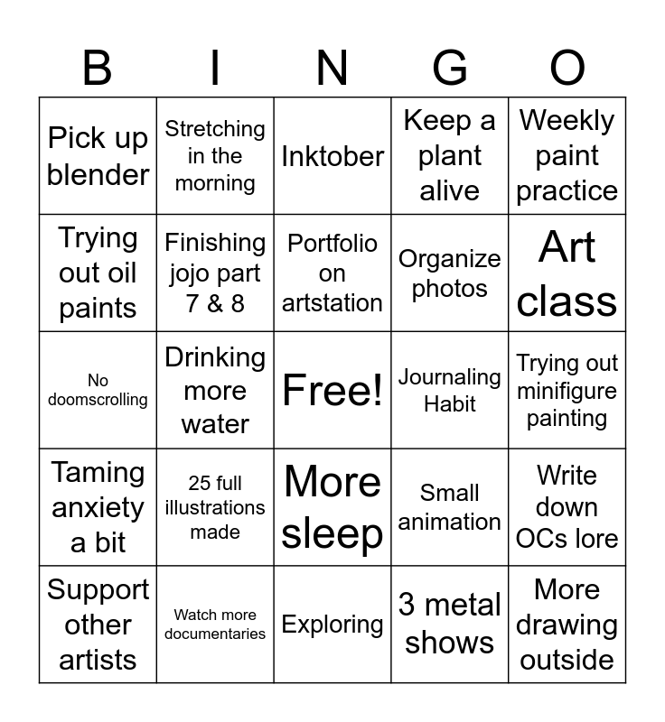 This bingo card has a free space and 24 words: 25 full illustrations made, Watch more documentaries, Portfolio on artstation, Support other artists, Weekly paint practice, Pick up blender, Trying out oil paints, Stretching in the morning, Journaling Habit, More sleep, Organize photos, No doomscrolling, Small animation, Write down OCs lore, Finishing jojo part 7 & 8, 3 metal shows, Trying out minifigure painting, Inktober, Art class, Drinking more water, More drawing outside, Taming anxiety a bit, Keep a plant alive and Exploring.