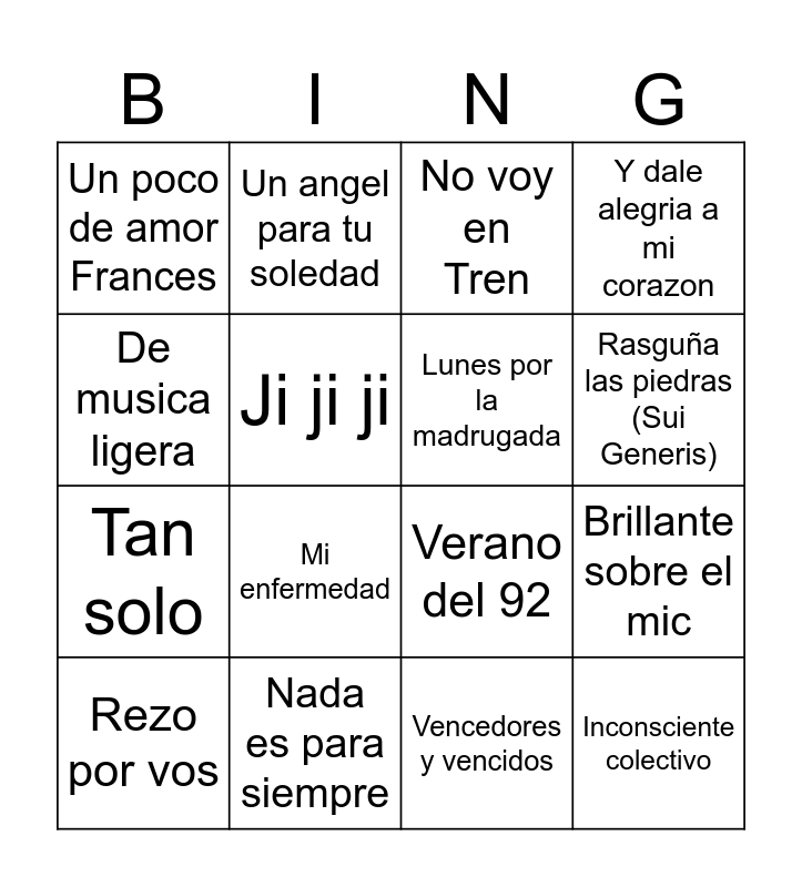 This bingo card has 26 words: La balsa (los gatos), Muchacha (Almendra), Rasguña las piedras (Sui Generis), Seminare, De musica ligera, Un poco de amor Frances, Ji ji ji, Un angel para tu soledad, Vencedores y vencidos, Yo canibal, Tan solo, Verano del 92, Ruleta, Dientes de cordero, Brillante sobre el mic, La rueda magica, Y dale alegria a mi corazon, Inconsciente colectivo, No voy en Tren, Rezo por vos, Mi enfermedad, Dulce condena, Nada es para siempre, Cielito lindo, Lunes por la madrugada and Mil horas.