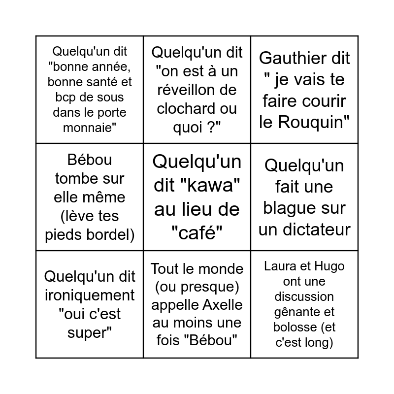 This bingo card has a free space and 8 words: Quelqu'un fait une blague sur un dictateur, Gauthier dit " je vais te faire courir le Rouquin", Quelqu'un dit "on est à un réveillon de clochard ou quoi ?", Quelqu'un dit ironiquement "oui c'est super", Quelqu'un dit "bonne année, bonne santé et bcp de sous dans le porte monnaie", Laura et Hugo ont une discussion gênante et bolosse (et c'est long), Bébou tombe sur elle même (lève tes pieds bordel) and Tout le monde (ou presque) appelle Axelle au moins une fois "Bébou".