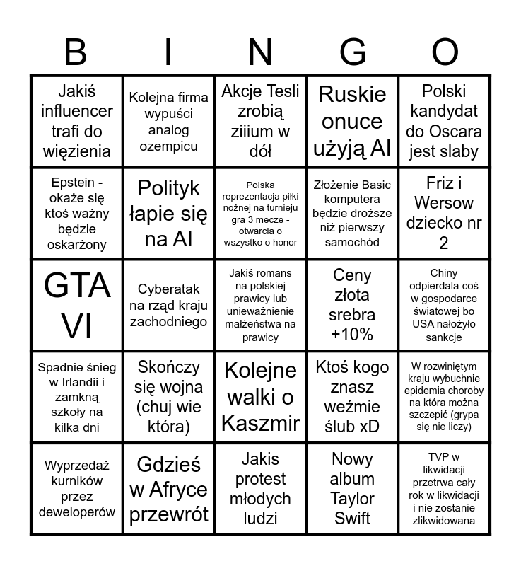 This bingo card has 25 words: Skończy się wojna (chuj wie która), Jakis protest młodych ludzi, Polska reprezentacja piłki nożnej na turnieju gra 3 mecze - otwarcia o wszystko o honor, Wyprzedaż kurników przez deweloperów, Polski kandydat do Oscara jest slaby, Jakiś influencer trafi do więzienia, Epstein - okaże się ktoś ważny będzie oskarżony, Kolejna firma wypuści analog ozempicu, Ceny złota srebra +10%, Kolejne walki o Kaszmir, Złożenie Basic komputera będzie droższe niż pierwszy samochód, GTA VI, Ktoś kogo znasz weźmie ślub xD, W rozwiniętym kraju wybuchnie epidemia choroby na która można szczepić (grypa się nie liczy), Polityk łapie się na AI, TVP w likwidacji przetrwa cały rok w likwidacji i nie zostanie zlikwidowana, Chiny odpierdala coś w gospodarce światowej bo USA nałożyło sankcje, Akcje Tesli zrobią ziiium w dół, Friz i Wersow dziecko nr 2, Cyberatak na rząd kraju zachodniego, Jakiś romans na polskiej prawicy lub unieważnienie małżeństwa na prawicy, Gdzieś w Afryce przewrót, Spadnie śnieg w Irlandii i zamkną szkoły na kilka dni, Ruskie onuce użyją AI and Nowy album Taylor Swift.