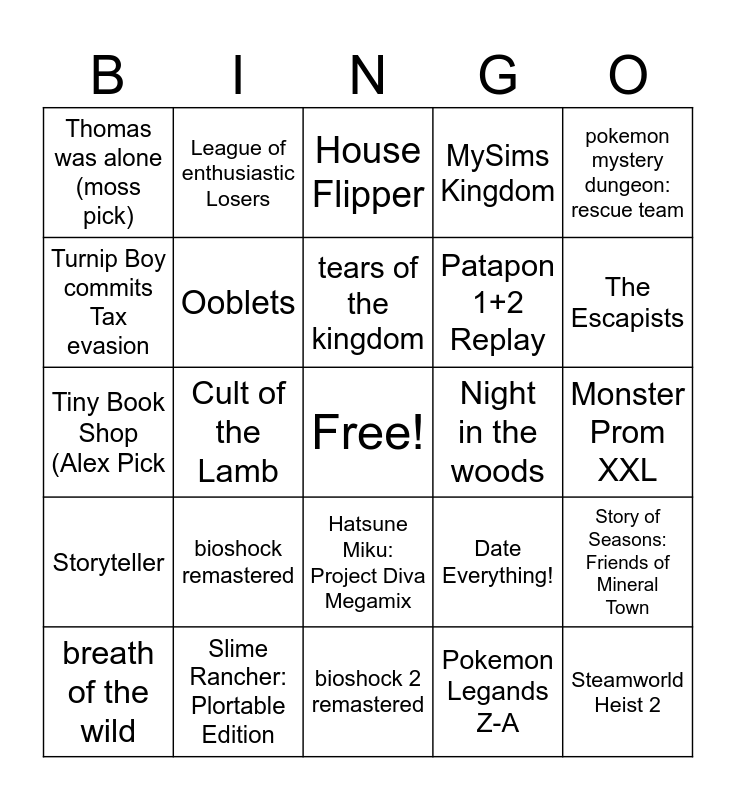 This bingo card has a free space and 25 words: bioshock remastered, bioshock 2 remastered, tears of the kingdom, breath of the wild, pokemon mystery dungeon: rescue team, Thomas was alone (moss pick), Turnip Boy commits Tax evasion, League of enthusiastic Losers, Night in the woods, Hatsune Miku: Project Diva Megamix, Patapon 1+2 Replay, Tiny Book Shop (Alex Pick, Date Everything!, Story of Seasons: Friends of Mineral Town, Ooblets, The Companion, Monster Prom XXL, House Flipper, The Escapists, Cult of the Lamb, Steamworld Heist 2, Slime Rancher: Plortable Edition, Storyteller, MySims Kingdom and Pokemon Legands Z-A.