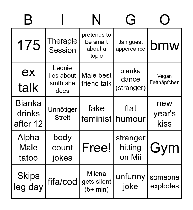This bingo card has 26 words: Free!, unfunny joke, Male best friend talk, fifa/cod, bmw, 175, ex talk, Therapie Session, new year's kiss, stranger hitting on Mii, bianka dance (stranger), Bianka drinks after 12, Gym, Skips leg day, Unnötiger Streit, Nils fcks up, Jan guest appereance, Alpha Male tatoo, pretends to be smart about a topic, fake feminist, Vegan Fettnäpfchen, Milena gets silent (5+ min), flat humour, body count jokes, Leonie lies about smth she does and someone explodes.