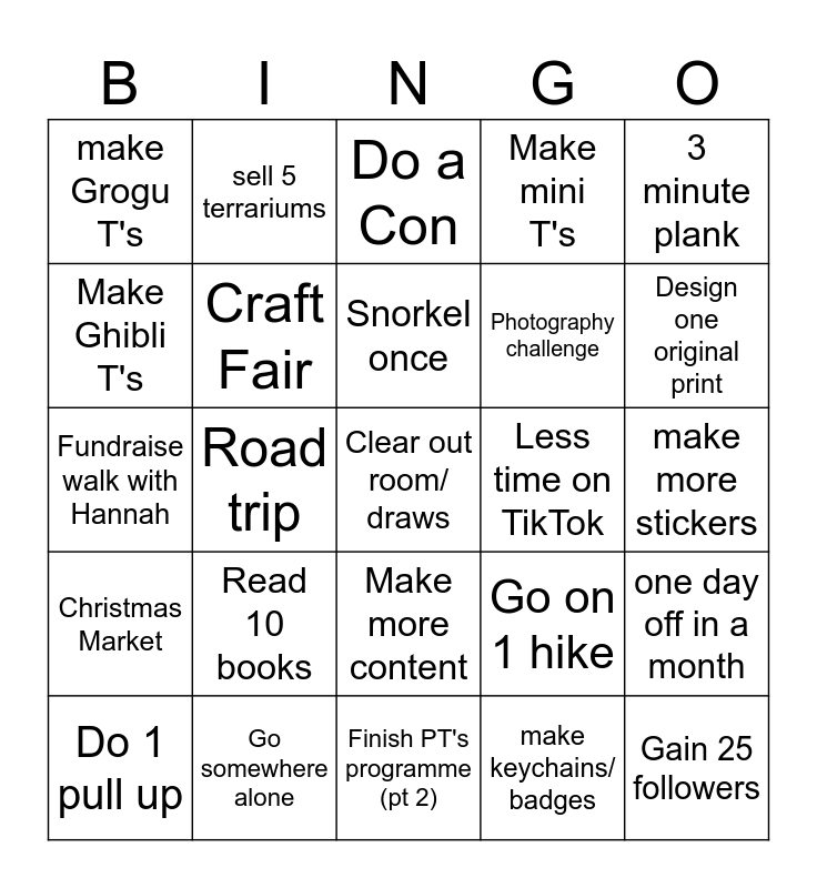 This bingo card has a free space and 24 words: Read 10 books, Go somewhere alone, Snorkel once, Do 1 pull up, 3 minute plank, make Grogu T's, Make Ghibli T's, sell 5 terrariums, Less time on TikTok, Make more content, Photography challenge, Fundraise walk with Hannah, Go on 1 hike, one day off in a month, Craft Fair, make keychains/ badges, make more stickers, Do a Con, Design one original print, Road trip, Gain 25 followers, Christmas Market, Make mini T's and Finish PT's programme (pt 2).