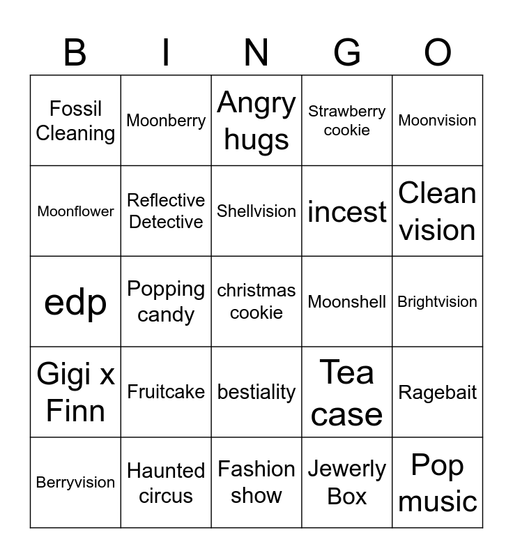 This bingo card has a free space and 24 words: Fruitcake, Haunted circus, Shellvision, Berryvision, Moonvision, Fossil Cleaning, Moonflower, Moonberry, Moonshell, bestiality, incest, edp, Tea case, Ragebait, Reflective Detective, Jewerly Box, Brightvision, Angry hugs, Clean vision, Popping candy, Pop music, Gigi x Finn, Strawberry cookie and Fashion show.