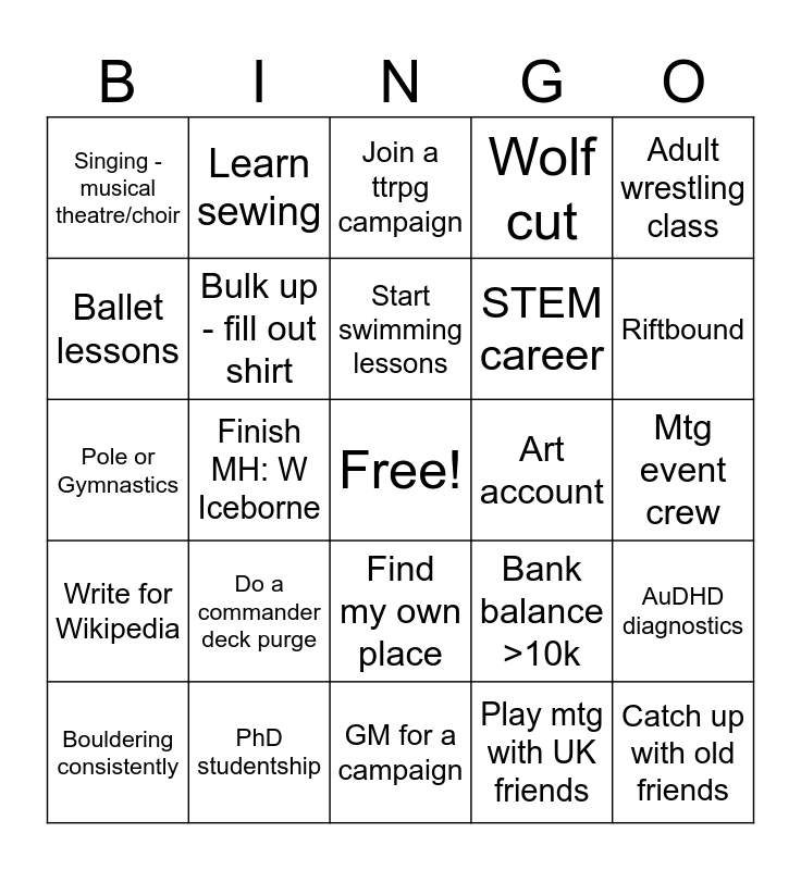 This bingo card has a free space and 24 words: Do a commander deck purge, PhD studentship, Start swimming lessons, Bouldering consistently, Adult wrestling class, Singing - musical theatre/choir, Ballet lessons, Learn sewing, Art account, Find my own place, STEM career, Pole or Gymnastics, Bank balance >10k, AuDHD diagnostics, Bulk up - fill out shirt, Play mtg with UK friends, Mtg event crew, Join a ttrpg campaign, Riftbound, Finish MH: W Iceborne, Catch up with old friends, Write for Wikipedia, Wolf cut and GM for a campaign.