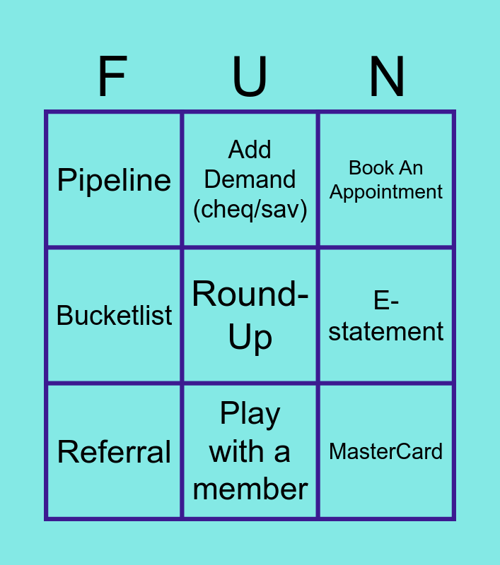 This bingo card has a free space and 11 words: Account review, Play with a member, MasterCard, Referral, Add Demand (cheq/sav), Book An Appointment, E-statement, Help a Teammate, Bucketlist, Pipeline and Make a teammate laugh.