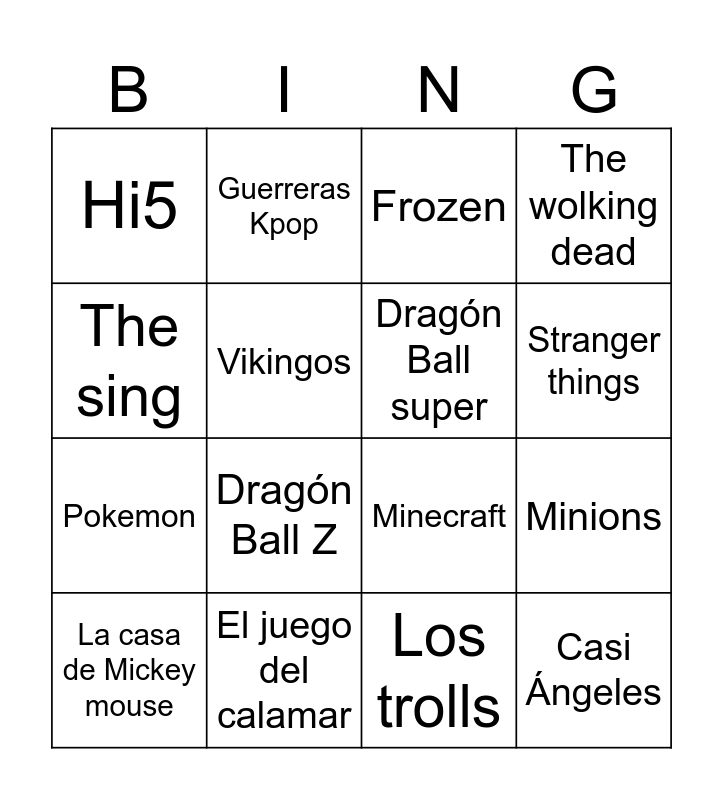 This bingo card has 18 words: Dragón Ball Z, Casi Ángeles, Frozen, Hi5, Minecraft, The wolking dead, La casa de Mickey mouse, Guerreras Kpop, Stranger things, Pokemon, Los trolls, The sing, Minions, Vikingos, Dragón Ball super, Floricienta, El juego del calamar and Los vengadores Infinity war.