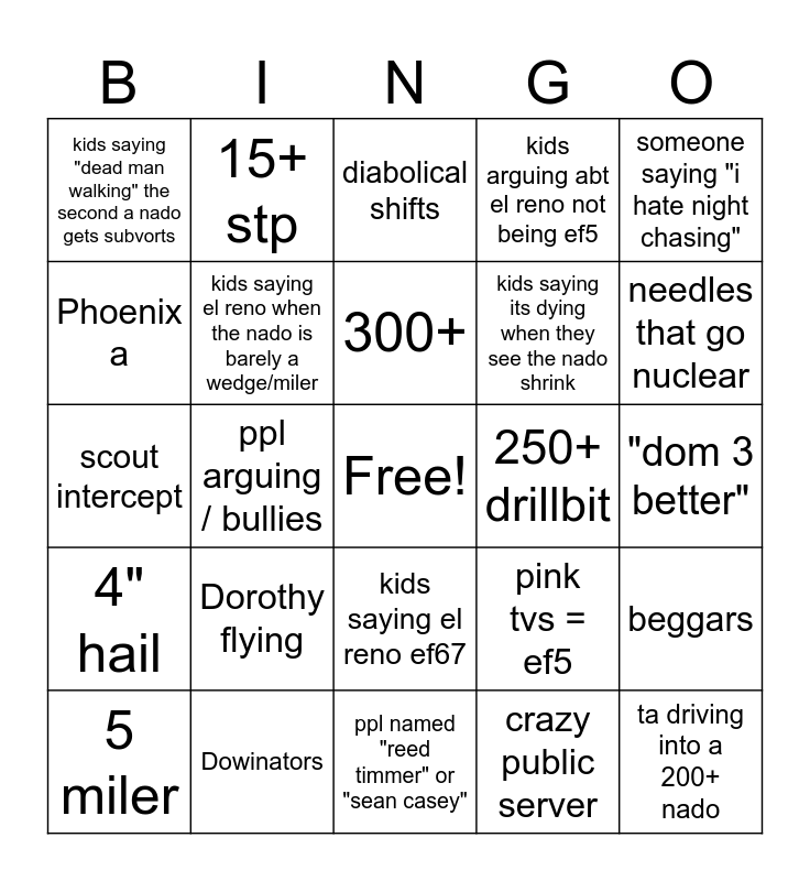 This bingo card has a free space and 24 words: Dorothy flying, Dowinators, 300+, 5 miler, someone saying "i hate night chasing", kids saying "dead man walking" the second a nado gets subvorts, Phoenix a, 15+ stp, 250+ drillbit, kids saying el reno ef67, kids saying its dying when they see the nado shrink, scout intercept, pink tvs = ef5, beggars, kids saying el reno when the nado is barely a wedge/miler, crazy public server, "dom 3 better", diabolical shifts, needles that go nuclear, ppl arguing / bullies, ta driving into a 200+ nado, 4" hail, kids arguing abt el reno not being ef5 and ppl named "reed timmer" or "sean casey".