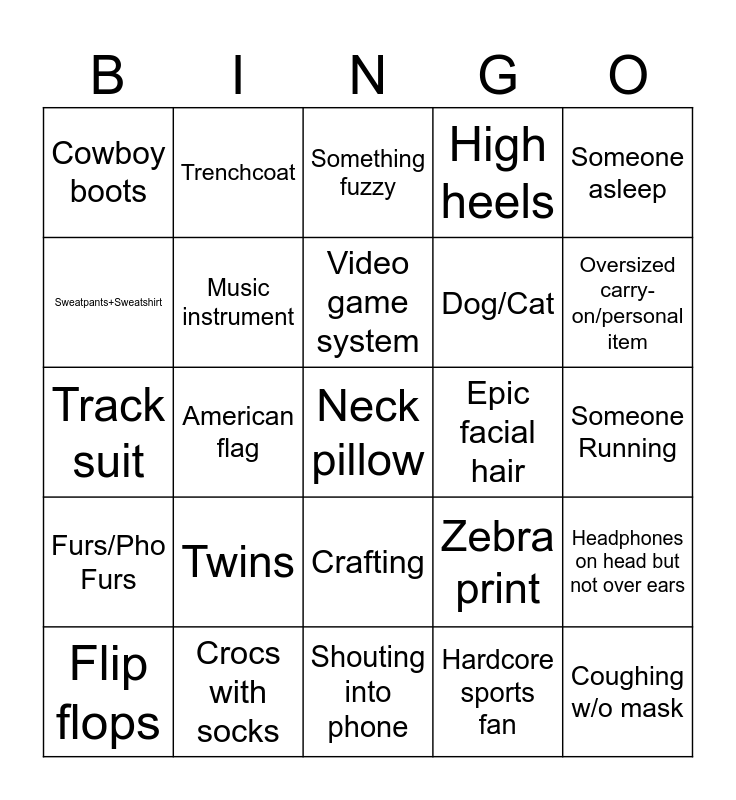 This bingo card has a free space and 30 words: Crocs with socks, Cowboy hat, American flag, Non-American flag, Cowboy boots, Something fuzzy, Music instrument, Crafting, Epic facial hair, Shouting into phone, Someone Running, Coughing w/o mask, Hardcore sports fan, Child riding luggage, Oversized carry-on/personal item, Leopard print, Zebra print, Furs/Pho Furs, Twins, Someone asleep, Track suit, Hot pink suitcase, Trenchcoat, Dog/Cat, Sweatpants+Sweatshirt, High heels, Headphones on head but not over ears, Flip flops, Video game system and Brightly Dyed hair.