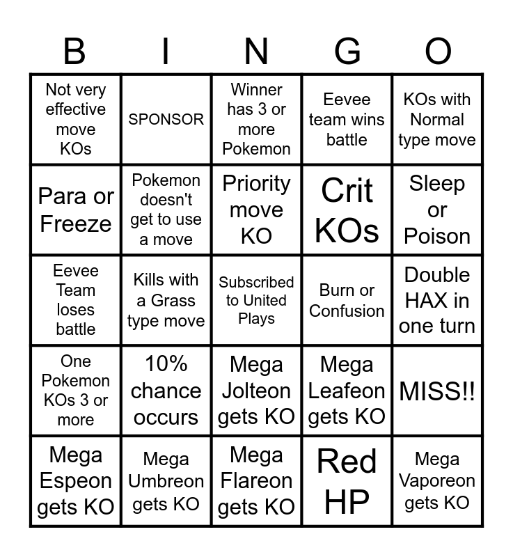 This bingo card has a free space and 24 words: 10% chance occurs, Mega Umbreon gets KO, Priority move KO, Mega Espeon gets KO, KOs with Normal type move, Not very effective move KOs, Para or Freeze, SPONSOR, Burn or Confusion, Mega Jolteon gets KO, Crit KOs, Eevee Team loses battle, Mega Leafeon gets KO, MISS!!, Pokemon doesn't get to use a move, Red HP, Double HAX in one turn, Winner has 3 or more Pokemon, Sleep or Poison, Kills with a Grass type move, Mega Vaporeon gets KO, One Pokemon KOs 3 or more, Eevee team wins battle and Mega Flareon gets KO.