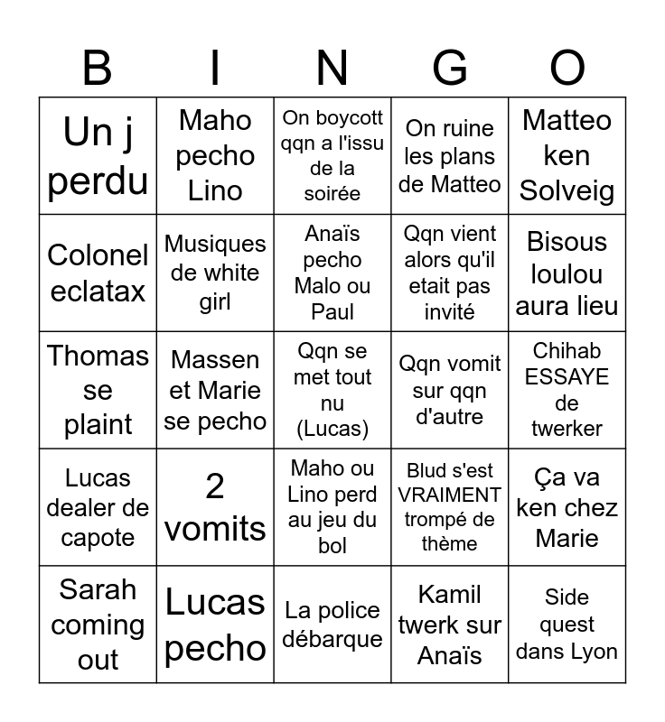 This bingo card has a free space and 24 words: 2 vomits, Lucas pecho, Anaïs pecho Malo ou Paul, Sarah coming out, Matteo ken Solveig, Un j perdu, Colonel eclatax, Maho pecho Lino, Qqn vomit sur qqn d'autre, Maho ou Lino perd au jeu du bol, Qqn vient alors qu'il etait pas invité, Thomas se plaint, Blud s'est VRAIMENT trompé de thème, Ça va ken chez Marie, Musiques de white girl, Kamil twerk sur Anaïs, Chihab ESSAYE de twerker, On boycott qqn a l'issu de la soirée, Bisous loulou aura lieu, Massen et Marie se pecho, Side quest dans Lyon, Lucas dealer de capote, On ruine les plans de Matteo and La police débarque.