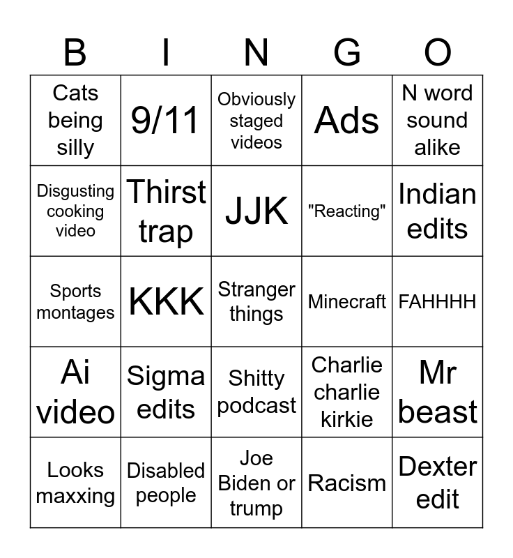 This bingo card has a free space and 24 words: Sigma edits, Disabled people, JJK, Looks maxxing, N word sound alike, Cats being silly, Disgusting cooking video, 9/11, Minecraft, Shitty podcast, "Reacting", Sports montages, Charlie charlie kirkie, Mr beast, Thirst trap, Racism, FAHHHH, Obviously staged videos, Indian edits, KKK, Dexter edit, Ai video, Ads and Joe Biden or trump.