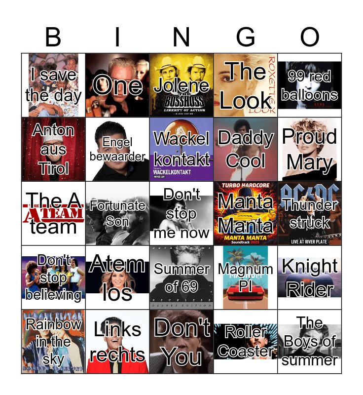This bingo card has 24 images, a free space and 24 words: Atem los, Links rechts, Wackel kontakt, Rainbow in the sky, 99 red balloons, I save the day, Anton aus Tirol, One, Manta Manta, Summer of 69, Daddy Cool, The A team, Magnum PI, Knight Rider, Engel bewaarder, Roller Coaster, Thunder struck, Jolene, Proud Mary, Fortunate Son, The Boys of summer, Don't stop believing, The Look and Don't You.