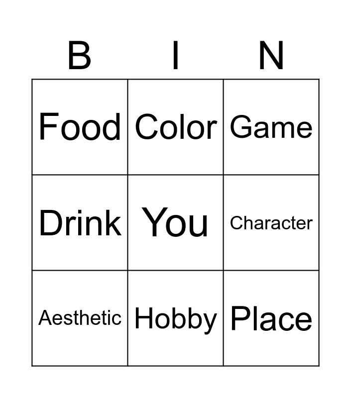 This bingo card has a free space and 8 words: Character, Game, Color, Aesthetic, Food, Place, Drink and Hobby.