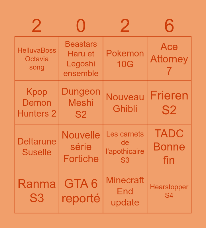 This bingo card has 16 words: GTA 6 reporté, TADC Bonne fin, Pokemon 10G, HelluvaBoss Octavia song, Deltarune Suselle, Beastars Haru et Legoshi ensemble, Les carnets de l'apothicaire S3, Minecraft End update, Kpop Demon Hunters 2, Dungeon Meshi S2, Ranma S3, Ace Attorney 7, Nouvelle série Fortiche, Frieren S2, Nouveau Ghibli and Hearstopper S4.
