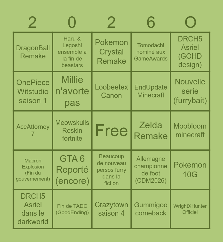 This bingo card has a free space and 24 words: GTA 6 Reporté (encore), Fin de TADC (GoodEnding), Loobeetex Canon, DRCH5 Asriel dans le darkworld, DRCH5 Asriel (GOHD design), DragonBall Remake, OnePiece Witstudio saison 1, Haru & Legoshi ensemble a la fin de beastars, Zelda Remake, Beaucoup de nouveau persos furry dans la fiction, EndUpdate Minecraft, AceAttorney 7, Allemagne championne de foot (CDM2026), Pokemon 10G, Millie n'avorte pas, Gummigoo comeback, Moobloom minecraft, Pokemon Crystal Remake, Nouvelle serie (furrybait), Meowskulls Reskin fortnite, WrightXHunter Officiel, Macron Explosion (Fin du gouvernement), Tomodachi nominé aux GameAwards and Crazytown saison 4.