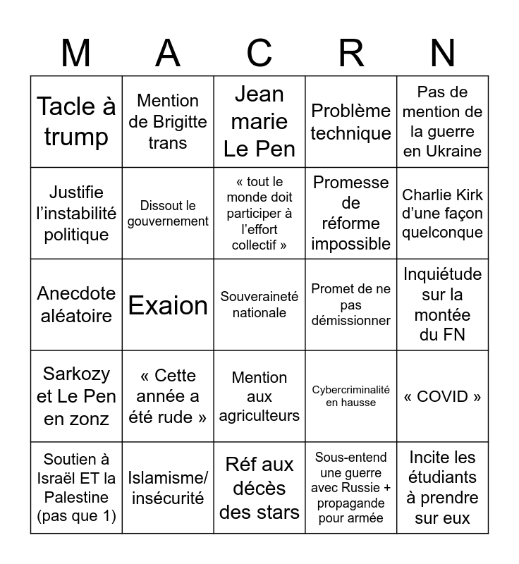 This bingo card has 25 words: « Cette année a été rude », Réf aux décès des stars, « tout le monde doit participer à l’effort collectif », Soutien à Israël ET la Palestine (pas que 1), Pas de mention de la guerre en Ukraine, Tacle à trump, Justifie l’instabilité politique, Mention de Brigitte trans, Promet de ne pas démissionner, Mention aux agriculteurs, Promesse de réforme impossible, Anecdote aléatoire, Cybercriminalité en hausse, « COVID », Dissout le gouvernement, Incite les étudiants à prendre sur eux, Inquiétude sur la montée du FN, Jean marie Le Pen, Charlie Kirk d’une façon quelconque, Exaion, Souveraineté nationale, Islamisme/ insécurité, Sarkozy et Le Pen en zonz, Problème technique and Sous-entend une guerre avec Russie + propagande pour armée.