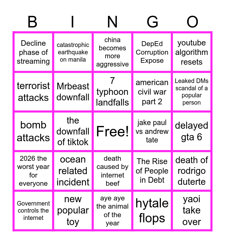 This bingo card has a free space and 29 words: Government controls the internet, nostolgia slop, the downfall of tiktok, another political assassination, Decline phase of streaming, china becomes more aggressive, Mrbeast downfall, ocean related incident, jake paul vs andrew tate, new popular toy, delayed gta 6, yaoi take over, aye aye the animal of the year, hytale flops, Leaked DMs scandal of a popular person, another CEO L, death caused by internet beef, 2026 the worst year for everyone, youtube algorithm resets, bomb attacks, The Rise of People in Debt, unredacted JEFiles released, american civil war part 2, terrorist attacks, DepEd Corruption Expose, catastrophic earthquake on manila, death of rodrigo duterte, 7 typhoon landfalls and I will become rich this year.