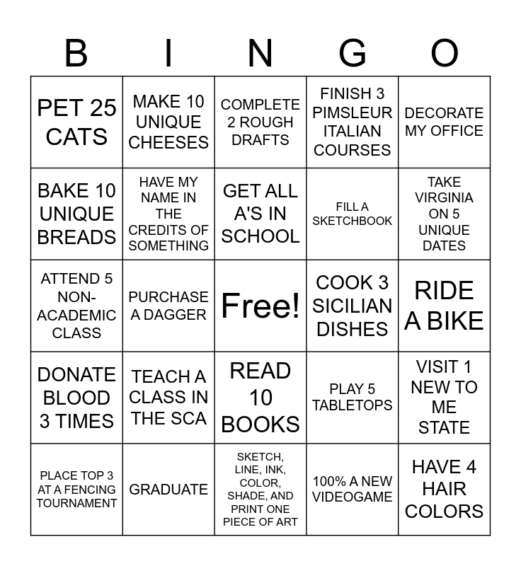 This bingo card has a free space and 24 words: TEACH A CLASS IN THE SCA, GRADUATE, GET ALL A'S IN SCHOOL, PLACE TOP 3 AT A FENCING TOURNAMENT, DECORATE MY OFFICE, PET 25 CATS, BAKE 10 UNIQUE BREADS, MAKE 10 UNIQUE CHEESES, COOK 3 SICILIAN DISHES, READ 10 BOOKS, FILL A SKETCHBOOK, ATTEND 5 NON-ACADEMIC CLASS, PLAY 5 TABLETOPS, VISIT 1 NEW TO ME STATE, HAVE MY NAME IN THE CREDITS OF SOMETHING, 100% A NEW VIDEOGAME, RIDE A BIKE, COMPLETE 2 ROUGH DRAFTS, TAKE VIRGINIA ON 5 UNIQUE DATES, PURCHASE A DAGGER, HAVE 4 HAIR COLORS, DONATE BLOOD 3 TIMES, FINISH 3 PIMSLEUR ITALIAN COURSES and SKETCH, LINE, INK, COLOR, SHADE, AND PRINT ONE PIECE OF ART.