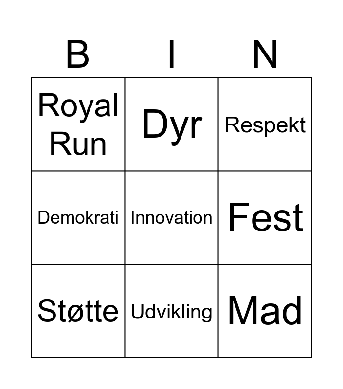 This bingo card has 9 words: Støtte, Respekt, Dyr, Demokrati, Royal Run, Fest, Innovation, Mad and Udvikling.